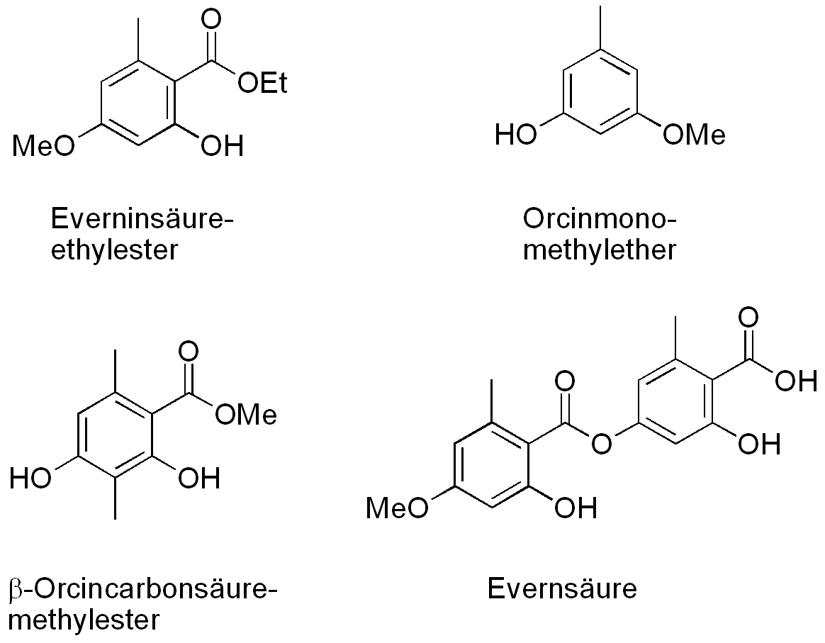Aus der alkoholischen Lösung des Eichenmoosextraktes gewannen Walbaum und Rosenthal Everninsäureethylester (Smp. 74°C), der sich beim Stehen des Extraktes zusammen mit harzigen Massen abgesetzt hatte. Sie nehmen an, dass der Ester erst beim Ausziehen der Flechte mit Ethanol durch Veresterung der im Ausgangsmaterial in freiem Zustande vorkommenden Everninsäure4) entstanden ist. In Evernia prunastri kommt auch Evernsäure vor, die beim Kochen mit Barytwasser (Bariumhydroxid) unter Abspaltung von Kohlendioxid in Orcin und Everninsäure zerfällt. Das Vorkommen von Everninsäureethylester im alkoholischen Eichenmoosextrakt kann daher auch auf alkoholytische Spaltung der Evernsäure und Veresterung der dabei entstehenden Everninsäure zurückgeführt werden.5) Diese Säure steht in naher Beziehung zum Orcinmonomethylether, da sie durch Verlust von Kohlendioxid in diesen übergehen würde. Darum ist auch ein Zusammenhang zwischen der Entstehung dieses Hauptbestandteils des Eichenmoosöls und der Evern- und Everninsäure wahrscheinlich.