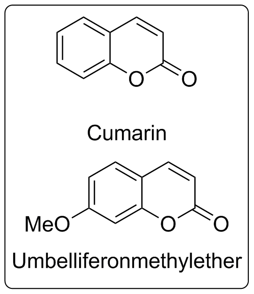 Über die Mengenverhältnisse des in verschiedenen Lavendelprodukten vorkommenden Cumarins und Umbelliferonmethylethers unterrichtet eine Arbeit von A. Ellmer.73) Aus einem destillierten Lavendelöl (Barrême) isolierte der Verfasser nach dem unten angegebenen Verfahren durch Ausschütteln mit kaltgesättigter, wässriger Barythydratlösung 0.8% Cumarin. Aus 1000 kg Lavendel würde man demnach bei einer Ölausbeute von 0.8% 64 g Cumarin erhalten. Andrerseits wurden aus einem durch Alkoholauswaschungen gewonnenen Extraktöl 3.4% Cumarin (Smp. 69°C) und 0.9% Umbelliferonmethylether (Smp. 117.5°) isoliert. Demzufolge sind in 1000 kg Lavendel 227 g Cumarin und mindestens 60 g Umbelliferonmethylether enthalten. Ein anderes konkretes (nicht mit Alkohol behandeltes) Benzolextraktöl enthielt mindestens 5% Umbelliferonmethylether (letzterer ist in Alkohol weniger leicht löslich als in Benzol). Der im Vergleich zu den destillierten Lavendelölen mindestens um das Vierfache höhere Cumaringehalt der Extraktöle lässt sich nach Ellmer mit der Annahme erklären, dass während der Extraktion der Pflanze noch ständig Cumaringlucosid gespalten und Cumarin frei wird. Bei der Destillation hingegen werden die in der Pflanze vorhandenen Fermente sofort zerstört, und nur das gerade vorhandene freie Cumarin geht mit dem Öl über. Hierin liegt auch eine Erklärung für den von dem Ausgangsmaterial abweichenden Geruch der Extraktöle.