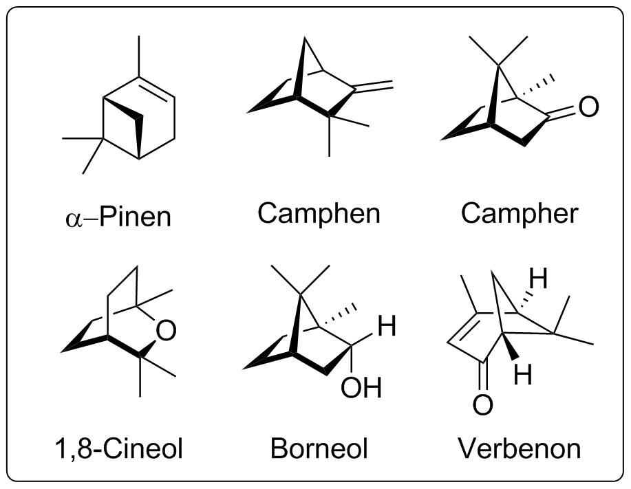 E. Reverchon und F. Senatore der Universitäten Salerno und Napoli untersuchten 1992 die Inhaltsstoffe von italienischem Rosmarinöl.83) Dabei konnte ein hoher Anteil an α-Pinen festgestellt werden. Als zweiter Hauptinhaltsstoff identifizierten die Forscher 1,8-Cineol, welches mit α-Pinen insgesamt fast 50% des Öls ausmacht.