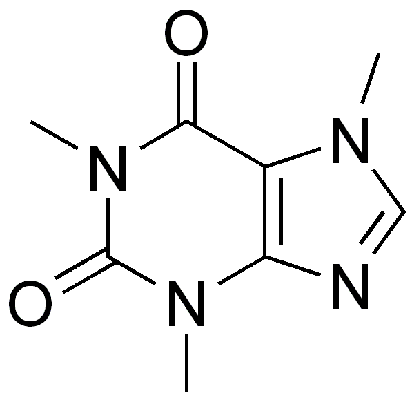 Alle Stickstoffatome des Coffeins sind dreifach substituiert. Das weiße Pulver ist mäßig wasserlöslich (~ 21 g/L bei 20°C). Es wirkt im Gegensatz zu anderen Alkaloiden nicht basisch.