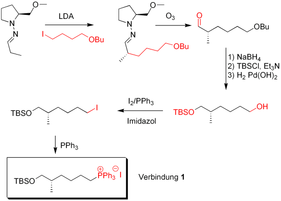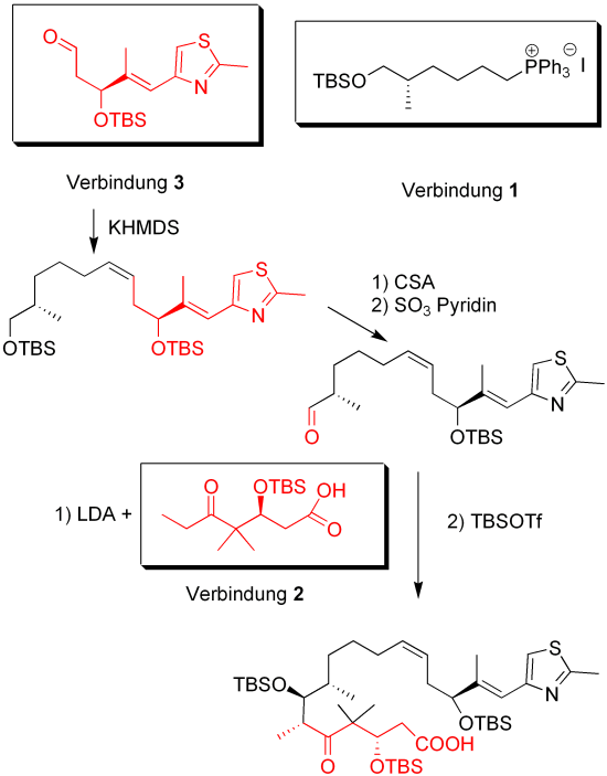 Verbindung 1 und 3 werden nun in einer Wittigreaktion umgesetzt und man erhält stereoselektiv das Cisprodukt. Die terminale TBS Schutzgruppe wird mit Camphersulfonoxid (CSA) abgespalten. Aus sterischen Gründen wird nur die primäre Alkoholgruppe entschützt. Die Oxidation mit SO3 und Pyridin liefert das Aldehyd. Dieses wird als Carbonylgruppe in einer Aldolreaktion mit Verbindung 2 umgesetzt. Bei dieser Reaktion wurde ein Racemat erhalten. Eine spätere Aufarbeitung der Enantiomere ist also nötig. Die entstandene Alkoholgruppe wurde mit TBS geschützt.