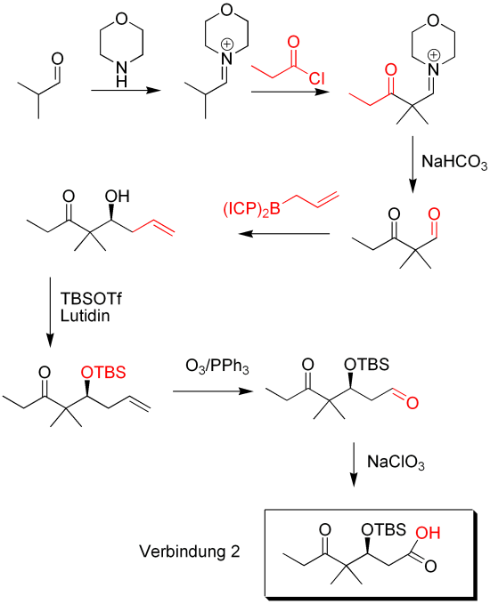 Verbindung 2 wird synthetisiert ausgehend von Isobutanal und Morpholin. In einer Enaminsynthese wird das Propansäurechlorid addiert. Mit NaHCO3 wird der Aldehyd zurückgewonnen. Allylboran greift das Aldehyd an und man erhält stereoselektiv das Produkt. Das gelingt durch die (+)-ICP Liganden, welche Stereoinformation übertragen. Nach anschließender TBS-Schützung wird die terminale Doppelbindung durch Ozonolyse in das Aldehyd überführt. Durch weitere Oxidation erhält man Verbindung 2.