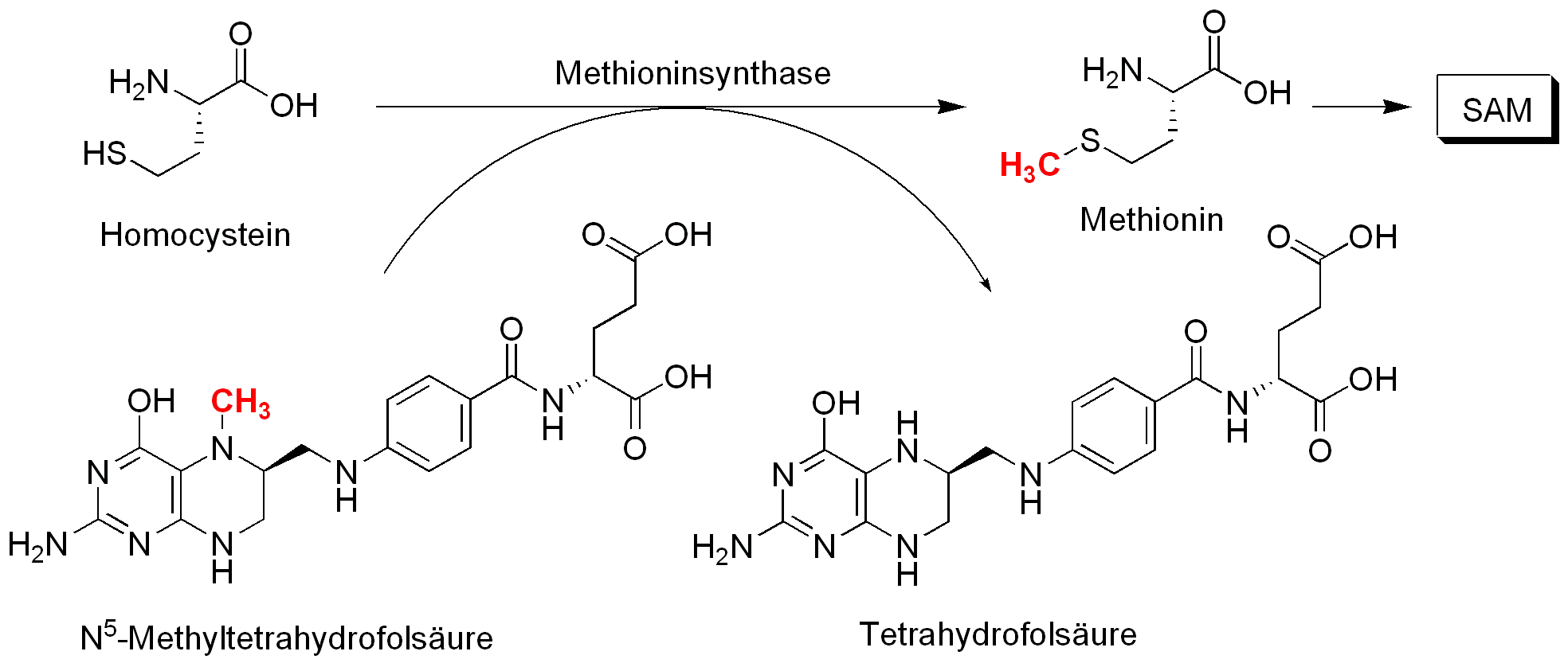 Übrig bleibt S-Adenosylhomocystein. Dieses kann zu Homocystein und Adenosin hydrolisiert werden. Homocystein kann durch N-5-Methyltetrahydrofolsäure zu Methionin reaktiviert werden. Methionin kann wie oben gezeigt mit ATP zu SAM umgesetzt werden.