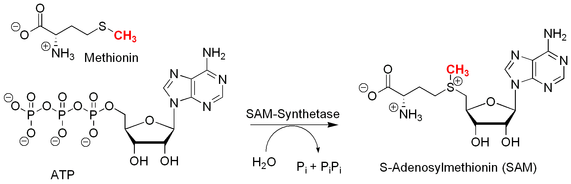 S-Adenosylmethionin entsteht durch die Reaktion zwischen Adenosyltriphosphat (ATP) und Methionin. Adenosyltriphosphat ist der molekulare Energieträger in den Organismen. Er wird bei der Verstoffwechslung von Glucose erzeugt. Das nucleophile Schwefelatom greift dabei in einer SN2 Reaktion am Kohlenstoffatom an und die Phosphate verlassen als Fluchtgruppe das Molekül.