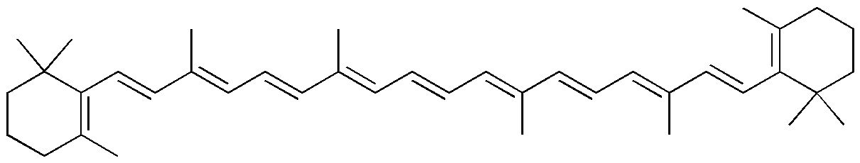β Carotin ist ein Tetraterpen, welches keine funktionelle Gruppen trägt. Es ist mehrfach ungesättigt und die Doppelbindungen sind konjugiert.